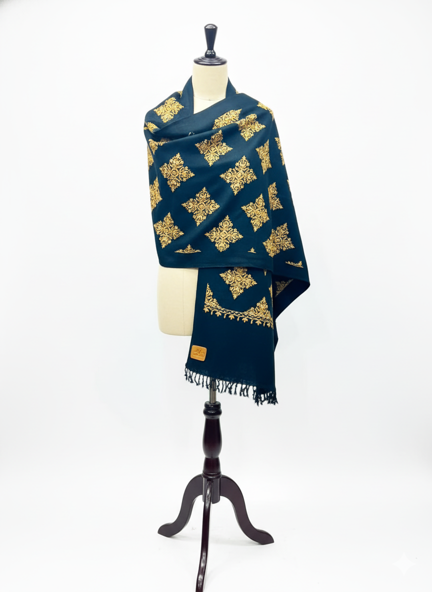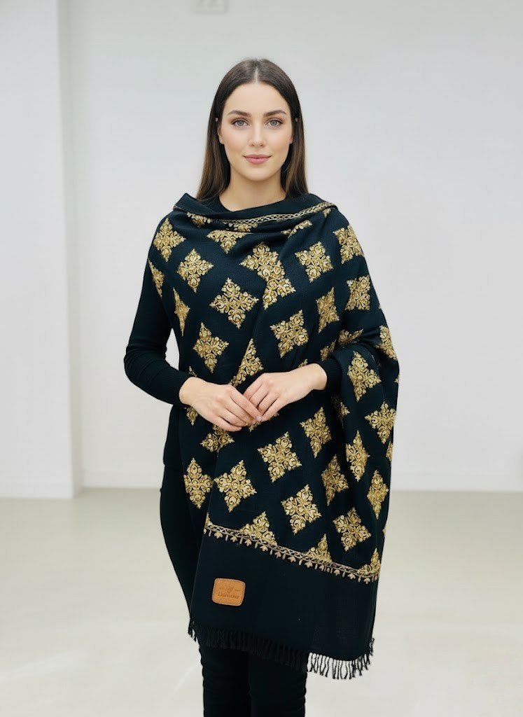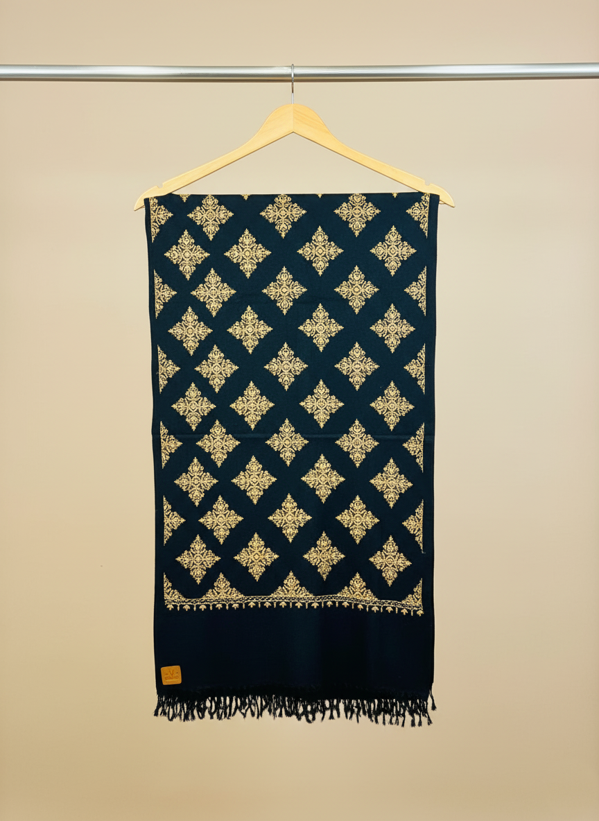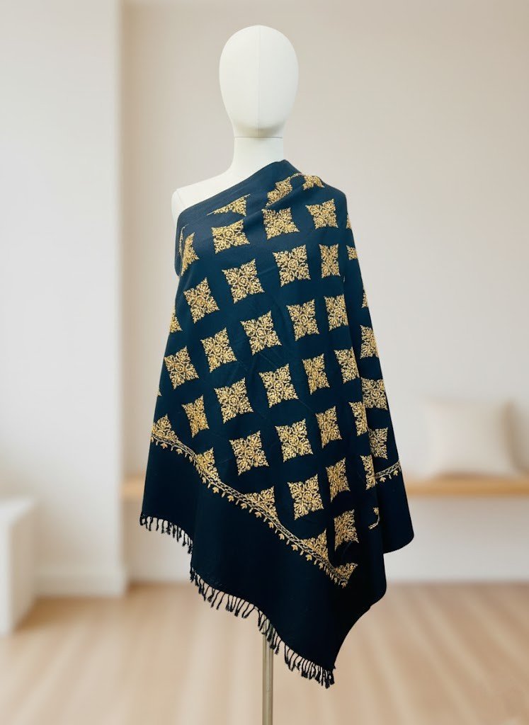 Handcrafted from 100% pure wool, the deep black canvas serves as a dramatic backdrop for the intricate golden motifs arranged in a diamond lattice — each one reminiscent of antique filigree and Mughal ornamentation. The border, rich and refined, frames the shawl like a royal portrait, while the soft texture ensures warmth without weight.
