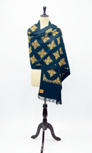 Bannuzai “Zewar-e-Zulmat” — a shawl that whispers elegance through every golden thread. Inspired by the quiet majesty of midnight and the ornate beauty of heirloom jewelry, this piece is a tribute to timeless sophistication.